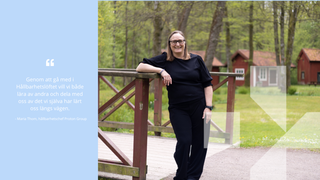 ”Vi har redan kommit en bit i vårt hållbarhetsarbete, men vi vet också att vi inte kan lösa utmaningarna på egen hand. Genom att gå med i Hållbarhetslöftet vill vi både lära av andra och dela med oss av det vi själva har lärt oss längs vägen. För oss handlar hållbarhet om att samarbeta, tänka nytt och göra det tillsammans – steg för steg mot ett mer hållbart Jönköpings län, och Sverige. Det ligger helt i linje med Proton Groups vision om att göra positiv skillnad.”